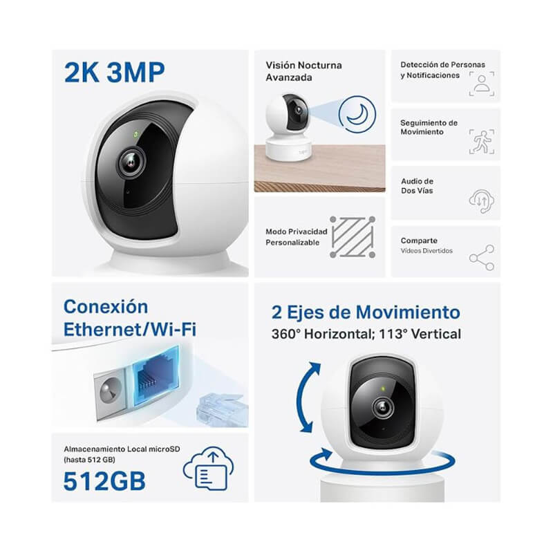 Protege tu hogar las 24 horas con la cámara Wi-Fi 360º. Ofrece grabación en 2K, visión nocturna mejorada, seguimiento automático y detección inteligente con IA. Personaliza zonas de actividad, almacena en microSD o en la nube, y controla todo fácilmente desde tu celular con la app Tapo. Ideal para mantener tu hogar seguro en cualquier momento del día